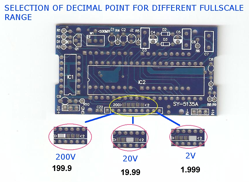2V full-scale by shorting (with solder) the 2 rightmost pads (see